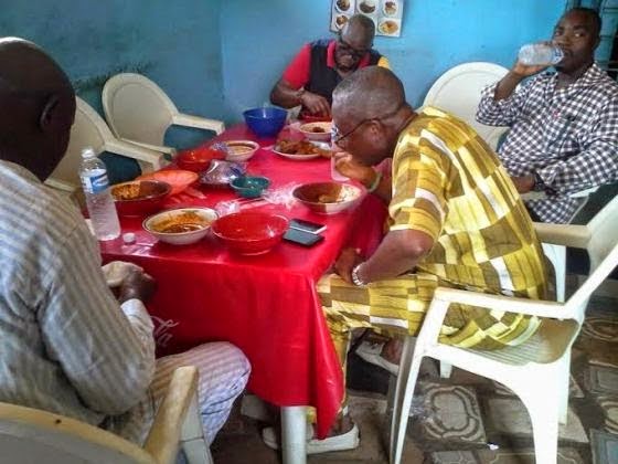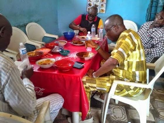 Ekiti state Governor, Ayo Fayose and his associates spotted eating at a Buka in Ajilosun in Ado-Ekiti, the state capital as of late.