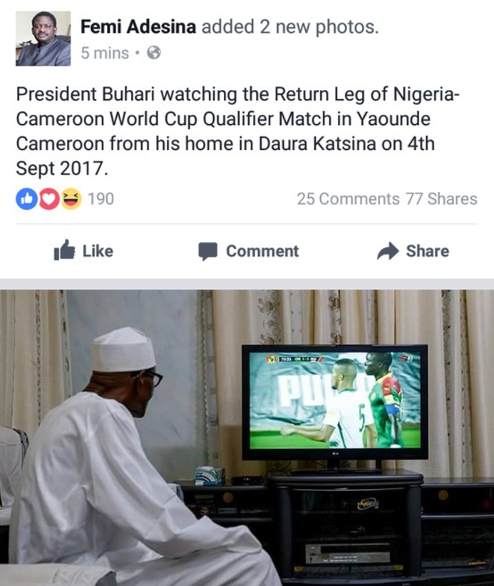 President Buhari watching the Return Leg of Nigeria-Cameroon World Cup Qualifier Match in Yaounde Cameroon from his home in Daura Katsina on 4th Sept 2017.