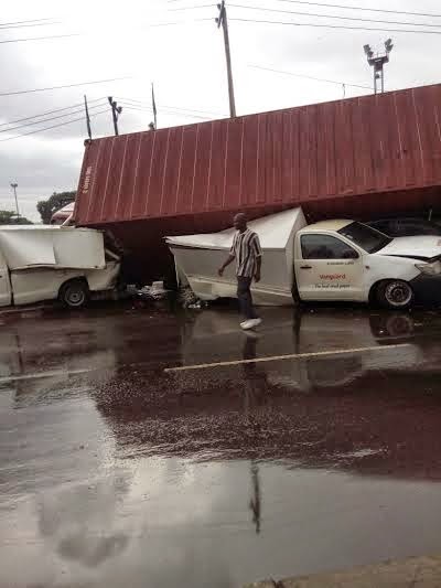 A trailer fell on three vehicles at Berger yard after Mile 2 on the way to Apapa before Berger Bridge where they sell autos. Mind blowing. See more photographs bellow.